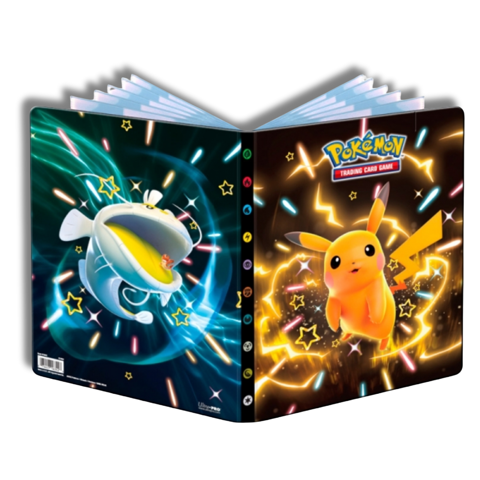 Archivador 9 bolsillos portfolio Pokemon Ultra Pro. Contiene 10 hojas de calidad. Para 90 cartas individuales o 252 a doble cara. Album Paldean Fates SV 4.5